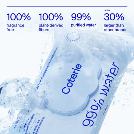 • THE BABY WIPES: Coterie unscented baby wipes are made with 99% water and 100% plant-based fibers. Each wipe is up to 30% larger than other brands, ultra-soft, and gentle on sensitive skin. Coterie wipes are EWG Verified and have received the National Eczema Association's Seal of Acceptance.