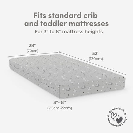• Perfect Fit for All Crib Sizes: Each set includes two crib sheets that are designed to perfectly fit standard crib mattresses (52” x 28”) as well as mini cribs and toddler beds. The sheets fit mattresses with a height of 3” to 8”, ensuring a snug and secure fit.