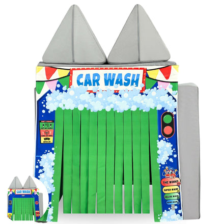 - CAR WASH DOUBLE PLAY PANEL - Step into the world of creative play with our Drive-Through Car Wash, where every moment is filled with excitement and imagination. On the front panel, your child will be delighted by interactive elements such as dangling brushes and pretend soap bubbles, turning mundane car washing into a thrilling experience. As they move through to the "exit" panel, the adventure continues with a "vacuum" station and vending machine, sparking their imagination and encouraging sensory exploration.