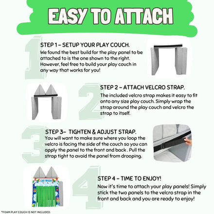 - ADJUSTABLE VELCRO STRAP - Each panel comes with an adjustable velcro strap. The strap makes it easy to wrap around play couches of all sizes. No couch? Pair it with our adjustable doorway pole (sold separately) to set up anywhere!