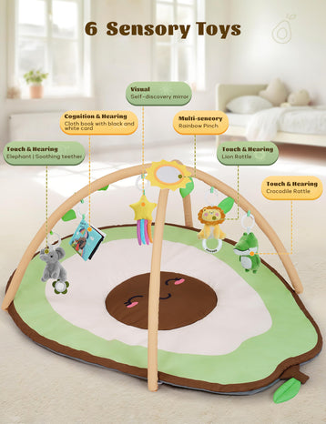 CoziBB Baby Play Gym Mat & Activity Mat, Baby Tummy Time Mat, Large Avocado Shaped Playmat with 6 Detachable Toys for Motor Skills & Sensory Development, Washable Infant Baby Essentials,Light Green