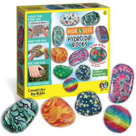 Spread happiness, encouragement, and make someone smile – one rock at a time! Creativity for Kids Glow in the Dark Rock Painting Kit comes with everything you need to paint, decorate, and hide 10 rocks. Personalize your rock art with 5 colors of glow-in-the-dark paint, 6 paint colors, tracking stickers, and paintbrushes. Hide and share your rock art! The included rock paint is weather-resistant allowing your rock art to withstand the elements when placed outdoors for fellow rock enthusiasts to find! Once you have painted your own glowing rock art, add tracking stickers to the bottom of your painted rocks to follow its travels. Rock painting is a creative arts and crafts for kids ages 6-8+ and beginners. Rock painting kits for kids ages 6-12+ are a screen-free gift that encourages creativity and outdoor play. With enough supplies to make 10 rocks, the Glow-in-the-Dark Painting Rocks craft kit is fun for one small group! This painting rock activity for kids makes the perfect creative gift for young artists who love arts and crafts. The ultimate creative Christmas gifts for kids! Explore creatively with kid-friendly arts and crafts for kids. Since 1976, Creativity for Kids has proudly created crafts for kids ages 6-8+ designed to inspire a lifetime of creativity and self-expression. The ultimate kids gifts for 6 year old girls and boys who loves art, creativity, and making unique kid crafts! Creativity for Kids boy and girl crafts kits features non-toxic, kid-friendly materials. The Glow in the Dark Rock Painting kit features permanent paint that may stain clothing and surfaces. This rock painting kit is recommended for ages 6-8+.