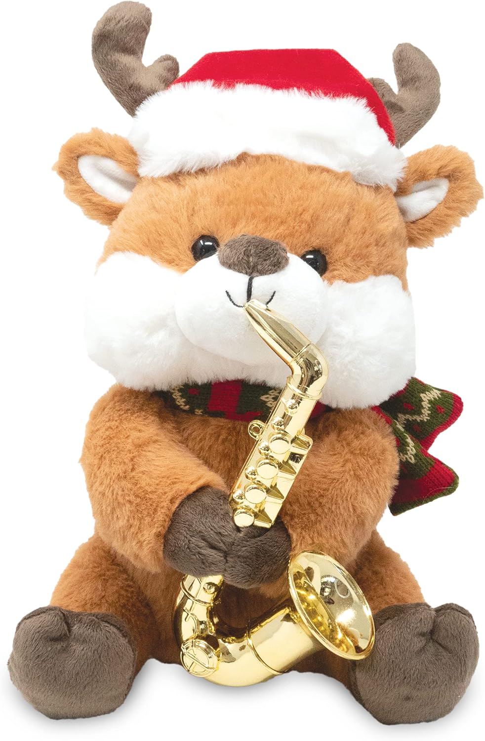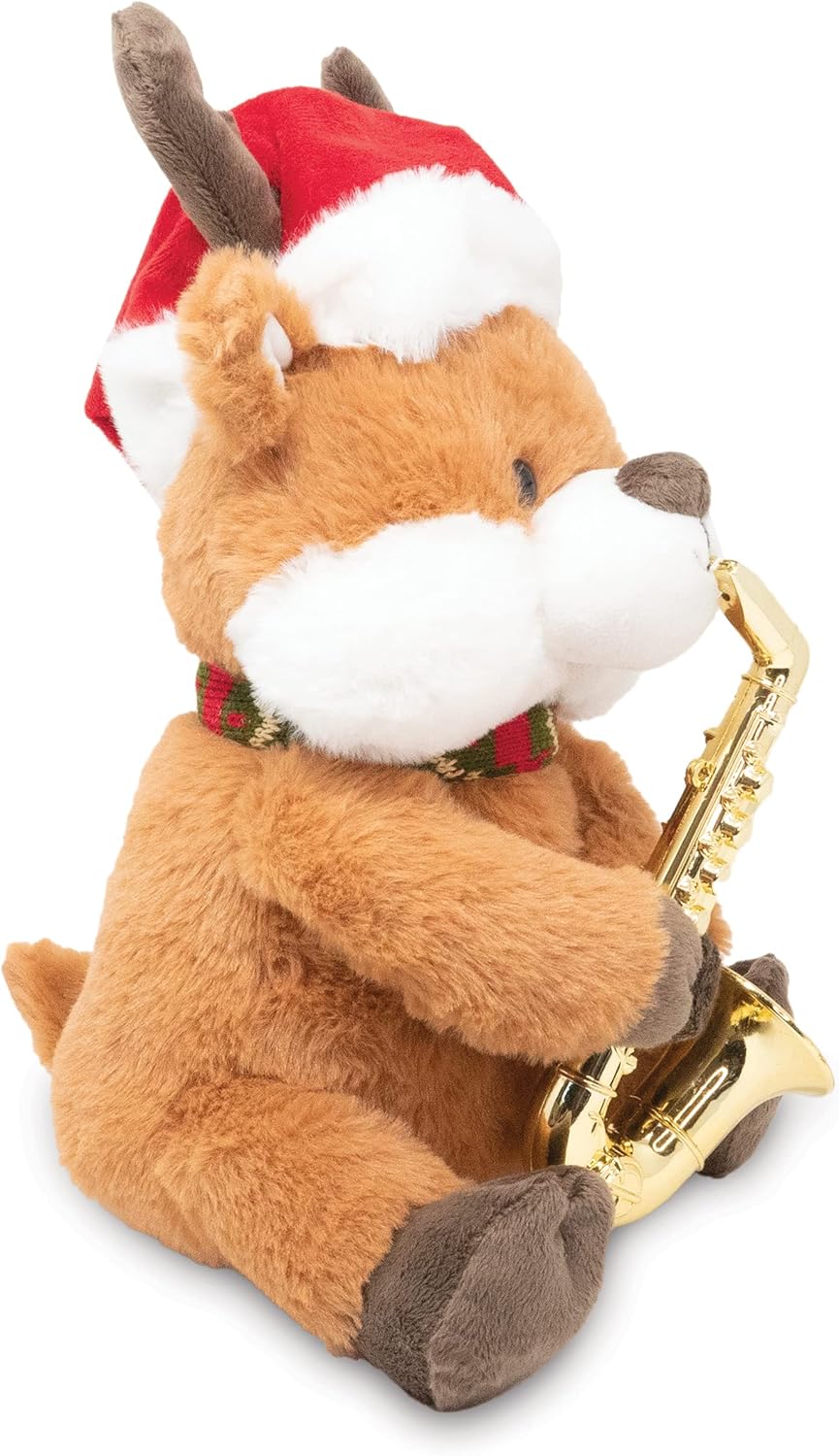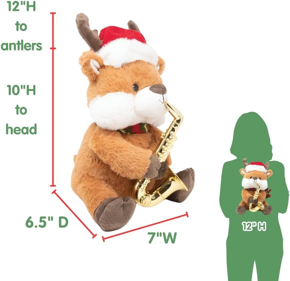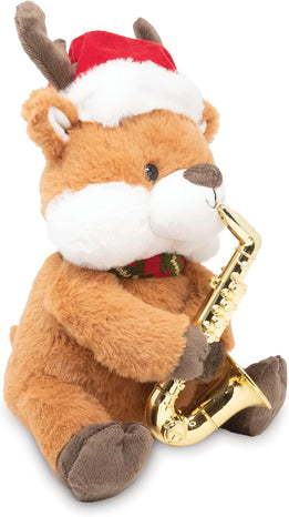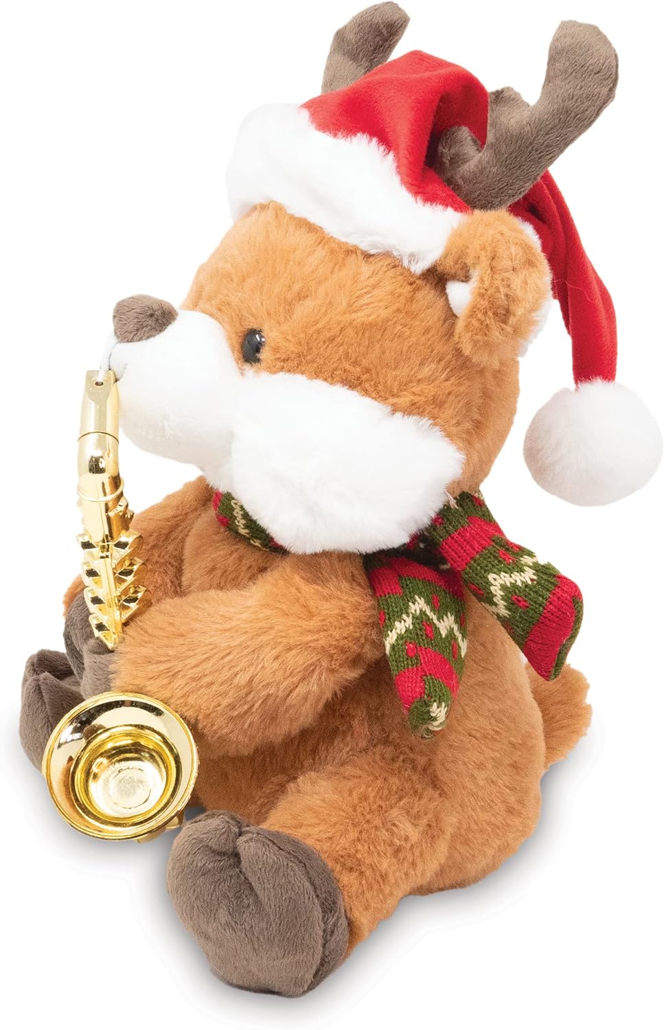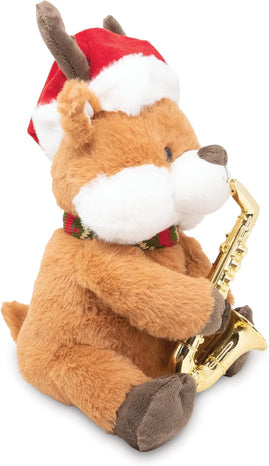 • MERRY SAXMAS STERLING - Sterling makes for great ambiance as you're cozying up and sitting by the fire! This cute reindeer wears a Santa hat and scarf and holds a beautiful saxophone.