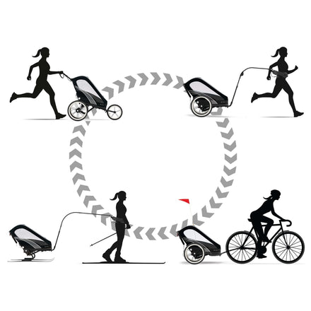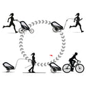 • Available accessories: 2-in-1 cup holder; cycling hitch; thru axle; hands-free running kit; cycling kit; skiing kit