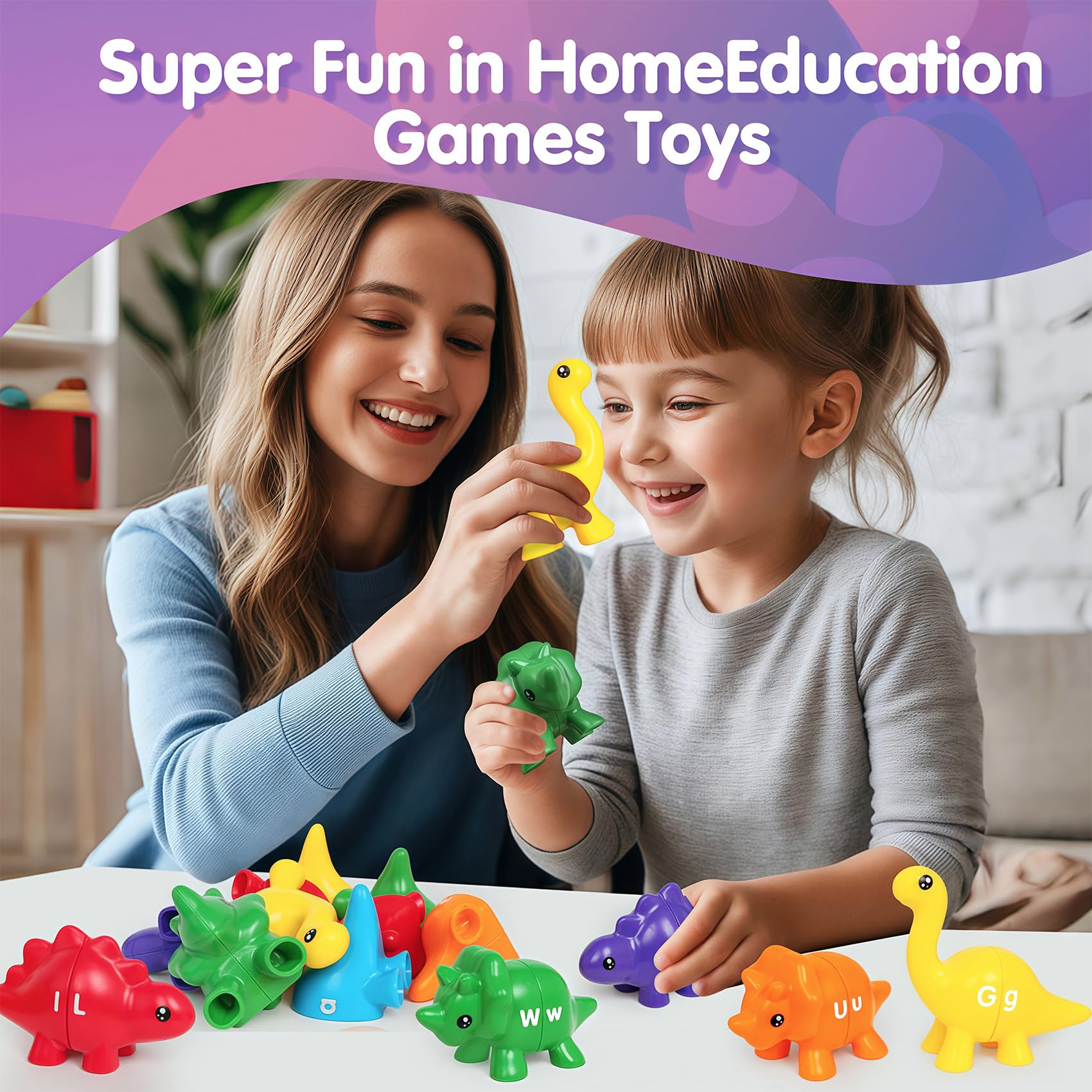 • Vivid and Fun Montessori Toys: Learning resources dinosaurs has 13 double-sided dinosaurs, showing a total of 26 uppercase and lowercase letters, and comes in six bright colors - red, yellow, blue, green, purple and orange, dinosaur matching set making letter recognition an exciting adventure for your child.