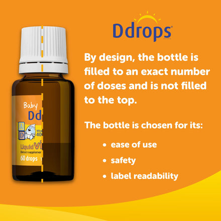 • **All of our Ddrops products are filled to the specific number of dosages listed on the bottle and box. The bottle is not meant to be filled to the very top, so it will appear to be partially full. The bottle size is chosen for ease of use, safety, and label readability.