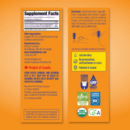 • Award-winning. Baby Ddrops is certified USDA Organic, non-GMO, a Mom’s Choice Gold Award Recipient.