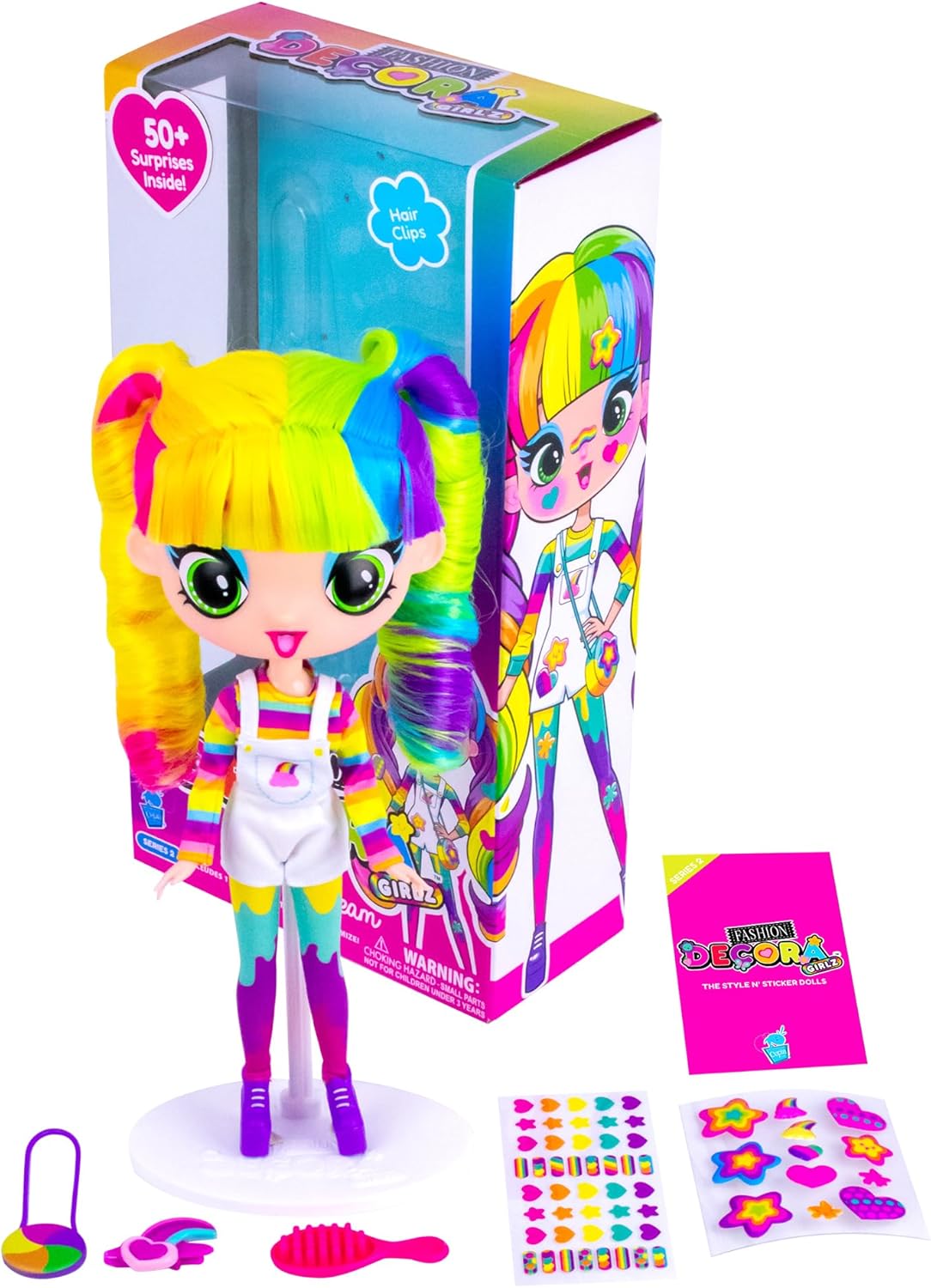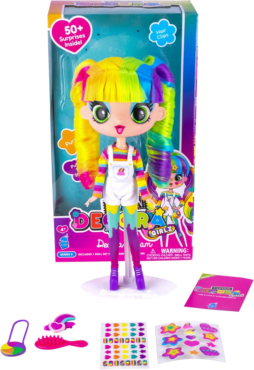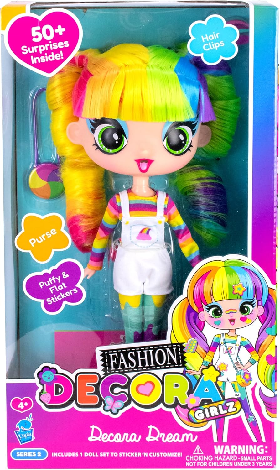 Decora Fashion Girlz Series 2– Decora Dream – 11” Fabric-Costumed Posable Vinyl Doll with Extra-Long Rainbow Hair, 50+ Surprises, Puffy & Flat Removable Stickers, and Accessories