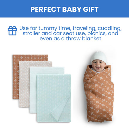 - PERFECT BABY GIFT: These cotton muslin blankets can be used for tummy time, traveling, cuddling, stroller and car seat use, picnics, and even as a throw blanket | Essential gift for baby showers, birthdays and holidays, it comes in a giftable box