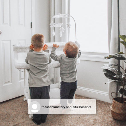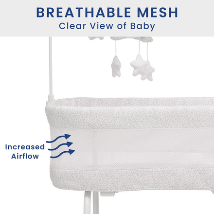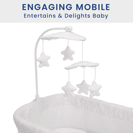 Details: The Delta Children SmartSleep Auto Glide Bassinet with Bluetooth is a modern close-to-the bed sleeper that boasts state of the art technology. The Bluetooth enabled design easily pairs with the Delta Children Connect App, where you'll be able to wirelessly control and customize the length and speed of the auto glide motion, sound level of the music and nature noises, as well as the brightness of the nightlight. Designed to help your baby fall asleep faster and stay asleep longer, the hands-free auto-glide motion will provide a calming environment while the two-tier toy arm with plush stars will engage and delight your baby if they wake up in the middle of the night. Breathable mesh sides all around provide increased airflow and a clear view of your sleeping baby. Other stand-out features include: large storage basket, comfortable 1-inch waterproof mattress pad with machine washable fitted sheet and wheels that make it easy to move around the house. Get the Delta Children SmartSleep Auto Glide Bassinet and help soothe baby back to sleep (without getting out of bed!). The Delta Children Connect App is free to download and available on the Apple App Store or on Google Play. This bassinet is recommended for babies 0-5 months. Max weight 30 lbs. Stop use at 5 months or once your infant begins to push up on their hands and knees, whichever comes first.