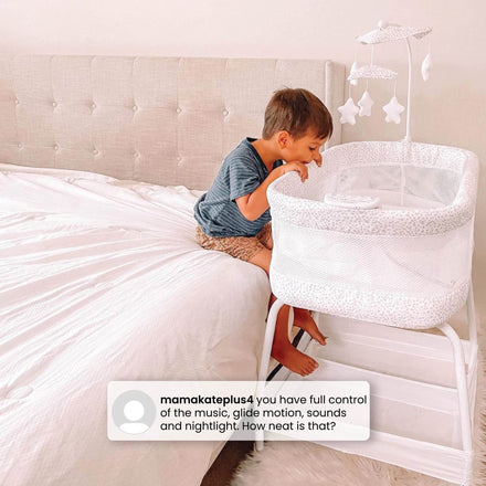 - SMART BABY ESSENTIALS: With Delta Children Connect app downloadable from Apple App Store or Google Play, this bassinet bedside sleeper can be remotely activated anywhere from within the house for a range of features, such as auto glide motion that can be customizable for length and speed to soothe baby; 5 choices each in calming music and nature sounds; and convenient nightlight. This means that BOTH you and your little one can enjoy a full night's sleep!