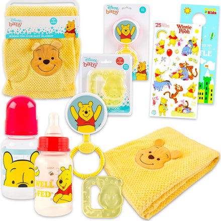 Disney Winnie The Pooh Baby Gift Set - 6 Pc Newborn Essentials Bundle with Blanket, Rattle, Bottle, Teether, Scrapbook Stickers, More | Baby Shower Gifts for Girls, Boys