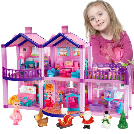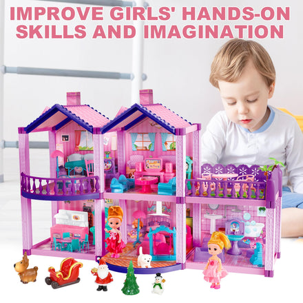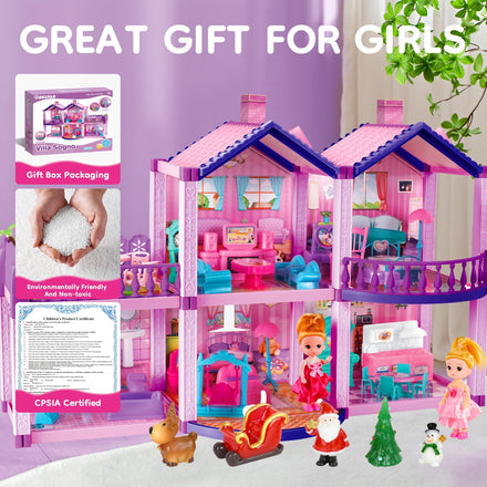 • 【What's in the Package】You will receive a 2-story doll house with 5 rooms. The package also includes 1 cute puppy, 2 gorgeous dolls and 5 Christmas themed ornaments such as Santa Claus, sleigh, reindeer, etc. Detailed instructions are included to help you build dream castle quickly