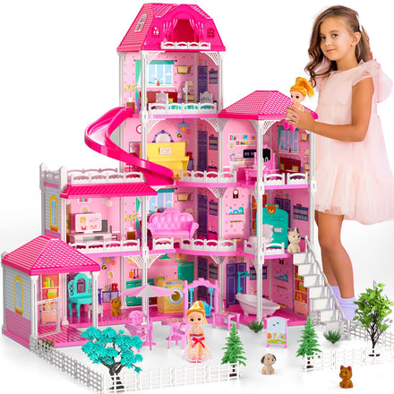 Dollhouses, Housetoys Furniture Pink Girl Toys, 4 Stories 10 Rooms Dreamhome with 2 Princesses Slide Accessories, Toddler Playhouse Gift for for 3 4 5 6 7 8 9 10 Year Old Girls Toys
