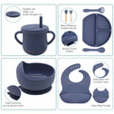 Dormlony 100% Silicone Baby Feeding Set,BPA Free Baby Dishes Set with Suction Bowl Divided Plate,Toddler Self Feeding Dish Set with Spoons Forks Sippy Cup and Bib, Baby Eating Utensils (Navy Blue)