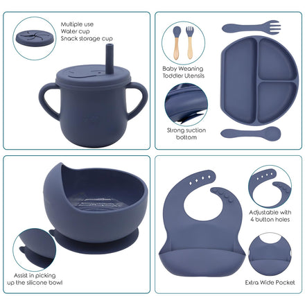 • 9 pcs Silicone Baby Feeding Set :our silicone baby feeding set includes 1 adjustable bib with a food catcher, 1 suction divided plate, 1 suction bowl, 1 training straw sippy cup, and 2 sets of spoon and fork.