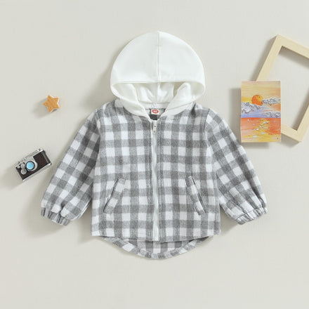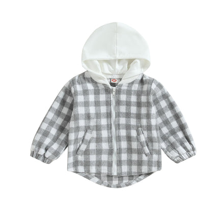 Douhoow Toddler Baby Plaid Jacket Baby Boy GIrl Flannel Hoodies Zip Up Hooded Fall Winter Outerwear Coat (Grey, 12-18 Months)