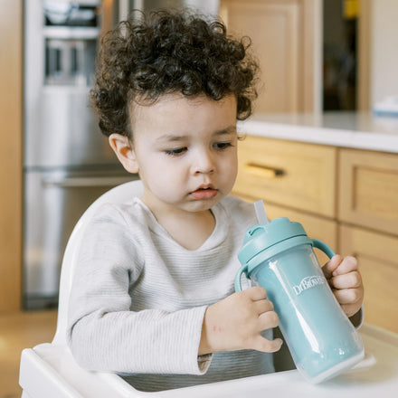 Details: Get the cup that keeps up with your little one – the spill-proof Dr. Brown's Milestones Insulated Straw Cup with a sliding lid. Made for little hands, the Insulated Straw Cup is lightweight with handles that lock in place for easy grip. Remove the handles as toddler grows for more developed sipping. A soft silicone straw teaches sipping skills, while a sliding lid keeps the straw clean and liquid in the cup when not in use. The double-walled tumbler keeps drinks fresh while on the go. Available in a variety of colors and playful designs, all with simple assembly and disassembly. Dishwasher (top rack) and sterilizer safe. 10 oz/300 mL. BPA free. Dr. Brown's Milestones Insulated Sippy Cup with Straw and Handles, Spill-Proof Tumbler with Lid, Green, 2 Pack. Age 12 Months and Up.