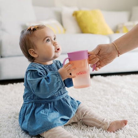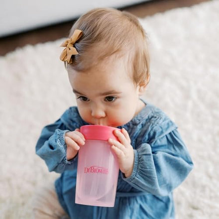 Details: The all-in-one set to help baby transition to straw and big kid sipping. Dr. Brown's Straw to 360° Cup Set includes a lid with super soft silicone straw to help baby develop new straw-sipping skills. The silicone is gentle on baby's sensitive mouth and is spill-proof! Then when baby is ready, switch to the Cheers 360 sippy cup lid. The 360-degree design lets baby drink from any edge, and the Sip and See clear silicone valve lets baby see inside without spilling for true leak-free learning. The Cheers 360 lid features handles that are easy for little hands to grasp and tilt while developing independent drinking skills. The cup is translucent so you can see when it's time for a refill, and the easy to assemble three-piece design is dishwasher (top rack) and sterilizer safe for easy cleaning.