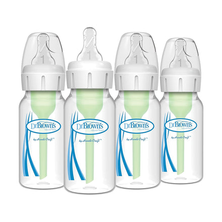 • Dr. Brown’s Natural Flow Anti-Colic Options+ Narrow Baby Bottles 4 oz/120 mL, with Level 1 Slow Flow Nipple, 4 Pack, 0m+