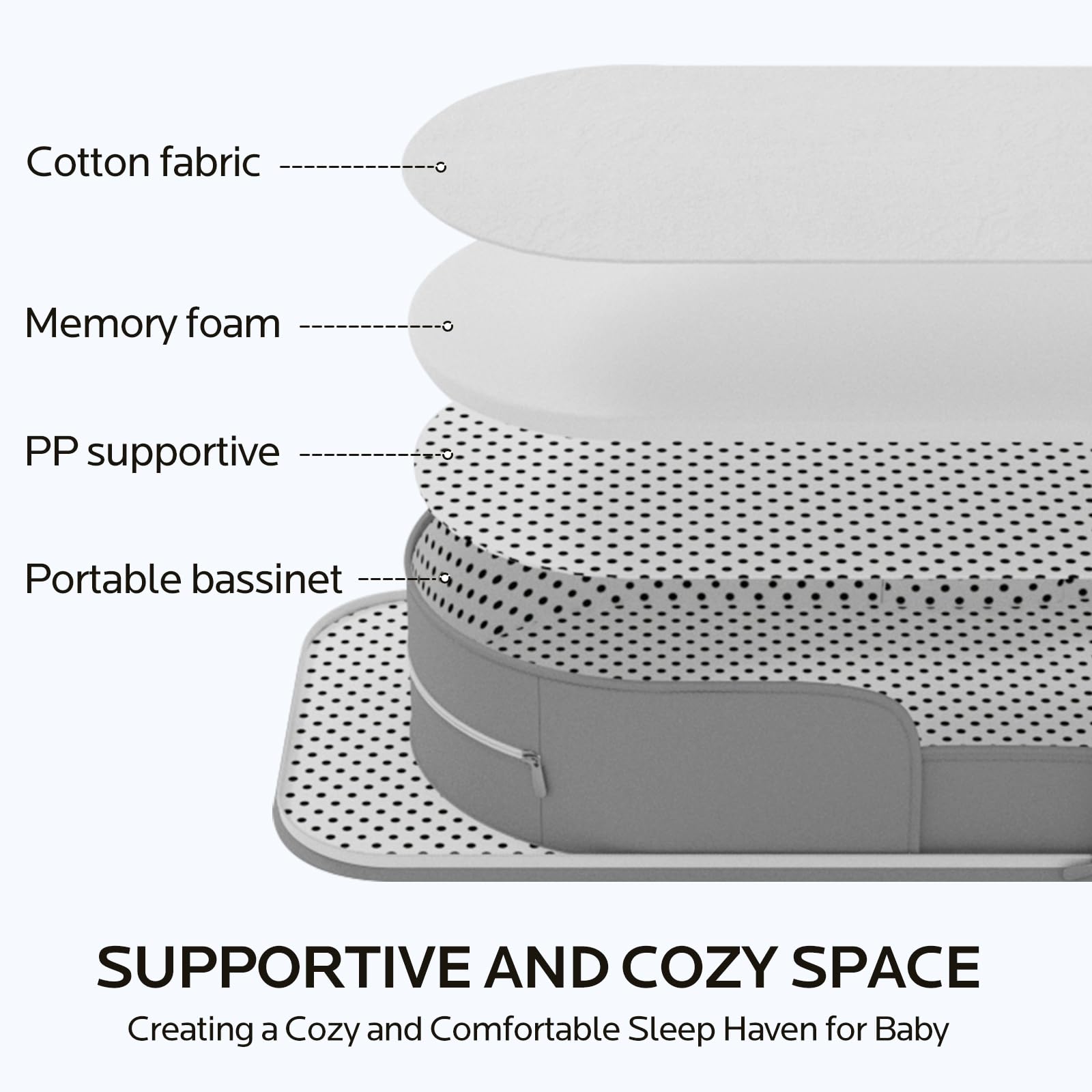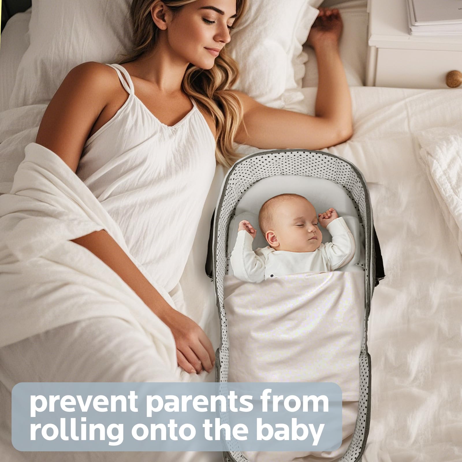 • Meets Strict Safety Standards:The travel bassinet for baby certified by CPSIA, ensuring your baby's safety is our top priority, and provides a safe sleeping environment for your baby. When used as beside sleeper, the frame creates a barrier, effectively preventing accidental rolling or turning onto the baby, giving you peace of mind