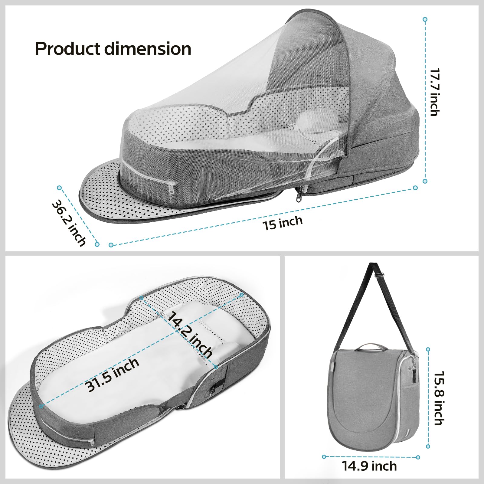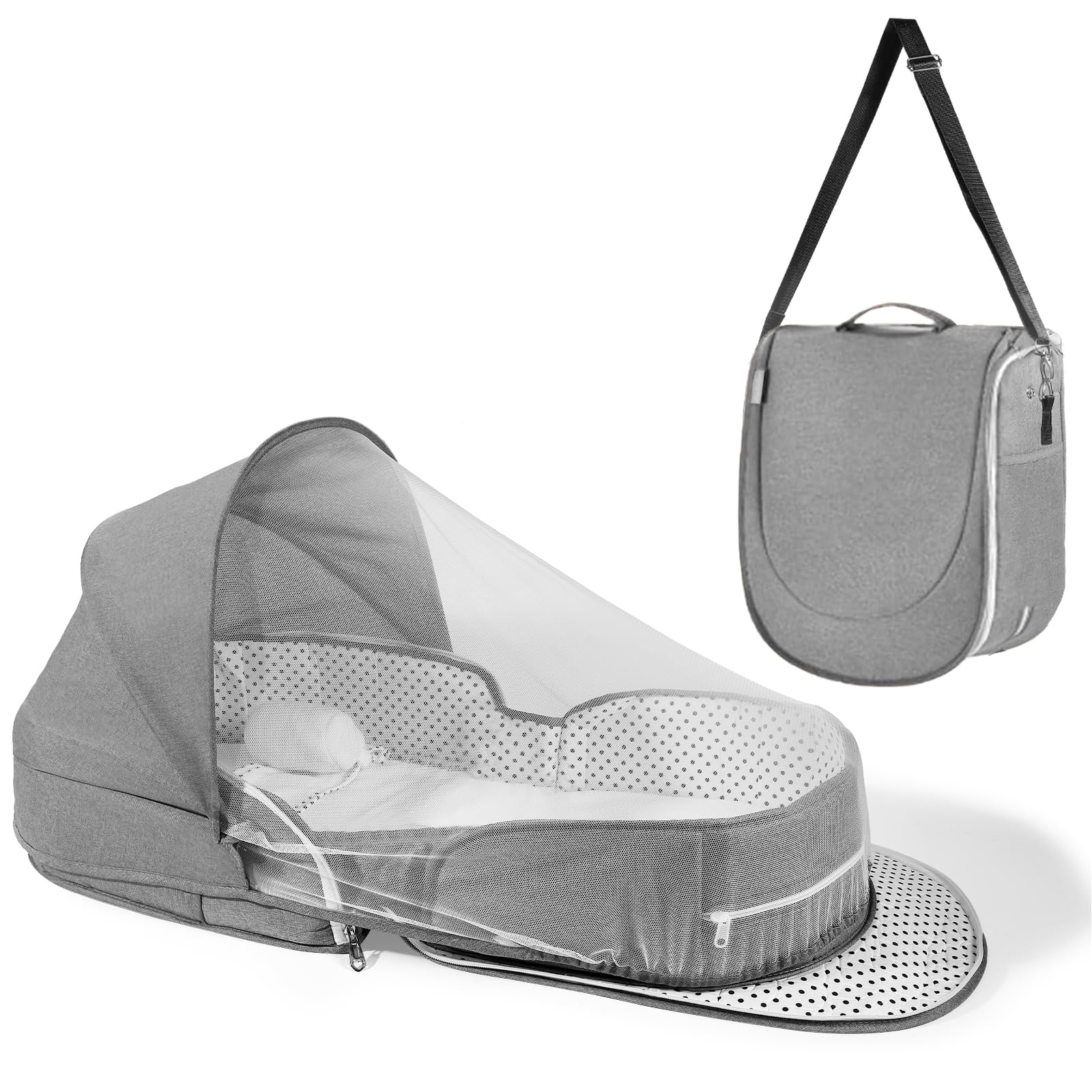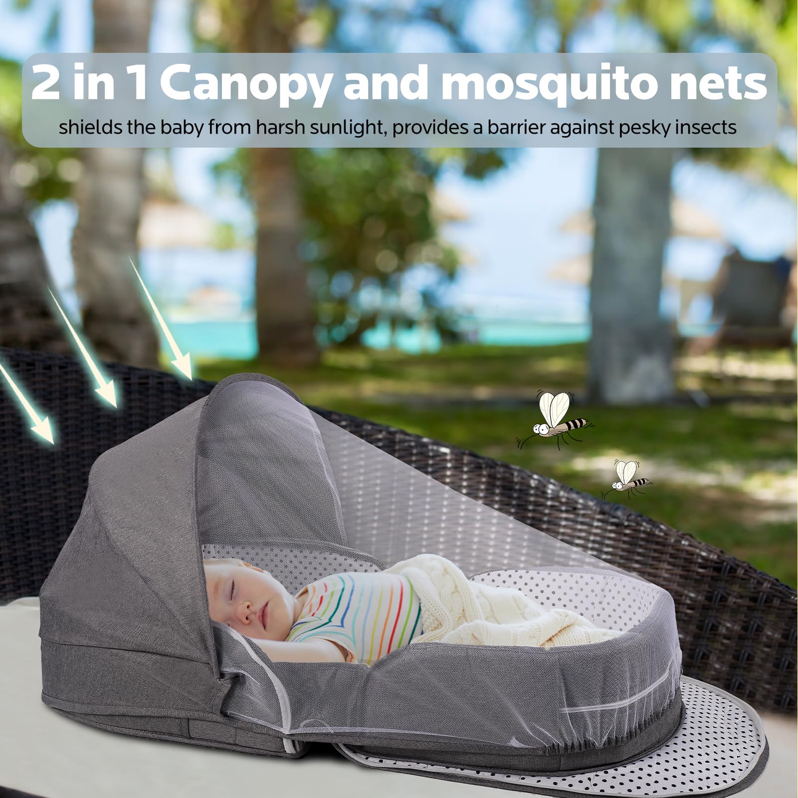 • 2 in 1 Sunshade and Mosquito Net: The travel baby bassinet bed with canopy & nets no need for separate sunshades or nets! The breathable mesh ensures airflow while blocking the light, providing peace of mind for both you and your infants