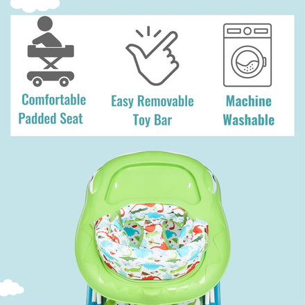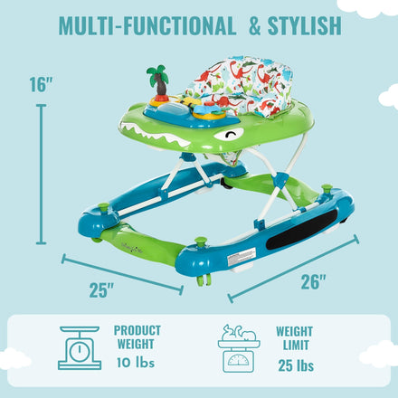 Details: Let your baby take their magical first steps in the Baby Steps Walker. Seated securely in the activity walker, they can slowly discover the world. Fun toys are perfect to keep LO entertained. The Baby Steps comes with multi-directional wheels for easy and smooth maneuvering. It conforms to ASTM F977 Safety Standards. Is suitable for babies between 6 and 24 months of age. A removable tray attached with colorful beach-themed toys helps your child develop fine motor skills. The Baby Steps Walker keeps pace with your growing baby thanks to the 3-position height setting. It comes in three vibrant colors and prints. The seat pad is machine-washable and you can wipe plastic parts with a damp cloth using mild soap. The Baby Steps folds compactly making it convenient for storage and travel. Products specs are 26L x 25 W x 16 H inches and it weighs 10lbs