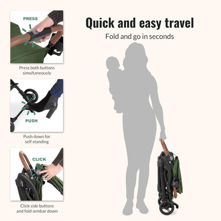 Glide through parenthood with ease—meet the Dream On Me RioGlide Compact Stroller. Built for busy families, this ultra-lightweight stroller (just 12.5 lbs.) folds in a flash with a one-hand folding system. Choose between two folding options: roll it like luggage or fold it small to carry by hand. The RioGlide’s compact, self-standing fold makes it perfect for city strolls, errands, or getaways. Parents will love the built-in cup holder, roomy storage basket, and automatic folding lock, while little ones ride in premium comfort thanks to an adjustable backrest, two-position footrest, and padded 5-point harness with T-crotch pad. The canopy with visor and peekaboo window with cover keep baby shaded and visible. With front suspension wheels and a removable PU bumper bar, the RioGlide is equal parts stylish and smart. Available in Black and Forest Green.