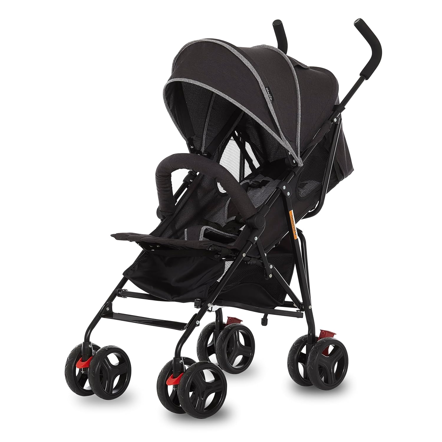 The Dream On Me VISTA Moonwalk stroller is super lightweight, durable and compact stroller, perfect for on the go parents. The comfort features for baby include: a full-sized seat, multi-position recline Padded seat back, hassle-free canopy with pop out sun visor, padded 5-point safety harness and more. Its swivel front wheels provide a smoother ride over curbs and uneven surfaces. The backrest can be adjusted to a sleeping position and the canopy provides good sunshade while your little one naps. The backrest position on the VISTA is adjusted single handed enabling a smooth transition between different positions. The angle and slope between the padded handle and rear wheels make space for easy walking. Vista Moonwalk comes with huge storage basket for baby and Mama's essentials. It's all comfort and convenience for you and your child. When your excursion is over, it folds compact for easy storage and travel. Time to go shopping.