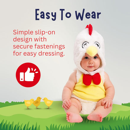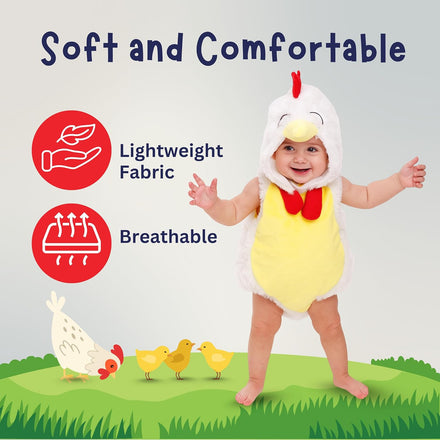 Dress-Up-America Chicken Costume for Toddlers and Babies The plush chicken hoody is a wonderful costume for kids. It will keep your child warm and cozy. This costume feels smooth on your child’s skin and allows your baby to move freely. It is large enough to pull over warm clothes during cold weather. Made from polyester comfortable superior quality material. A baby's first costume is an important event, one that will be celebrated in lots of photos and stay in everyone's memories, choose a costume wisely. The combination of attractive colors will attract lots of compliments and attention. There are 3 different size variations 0-6 Months, 6-12 months and 12-24 Months. Additional Features: ► Velcro closure for easy diapering and changing. ► It is easily washed and dried. ► Material is Soft, fluffy and comfortable. ► Easy to wear