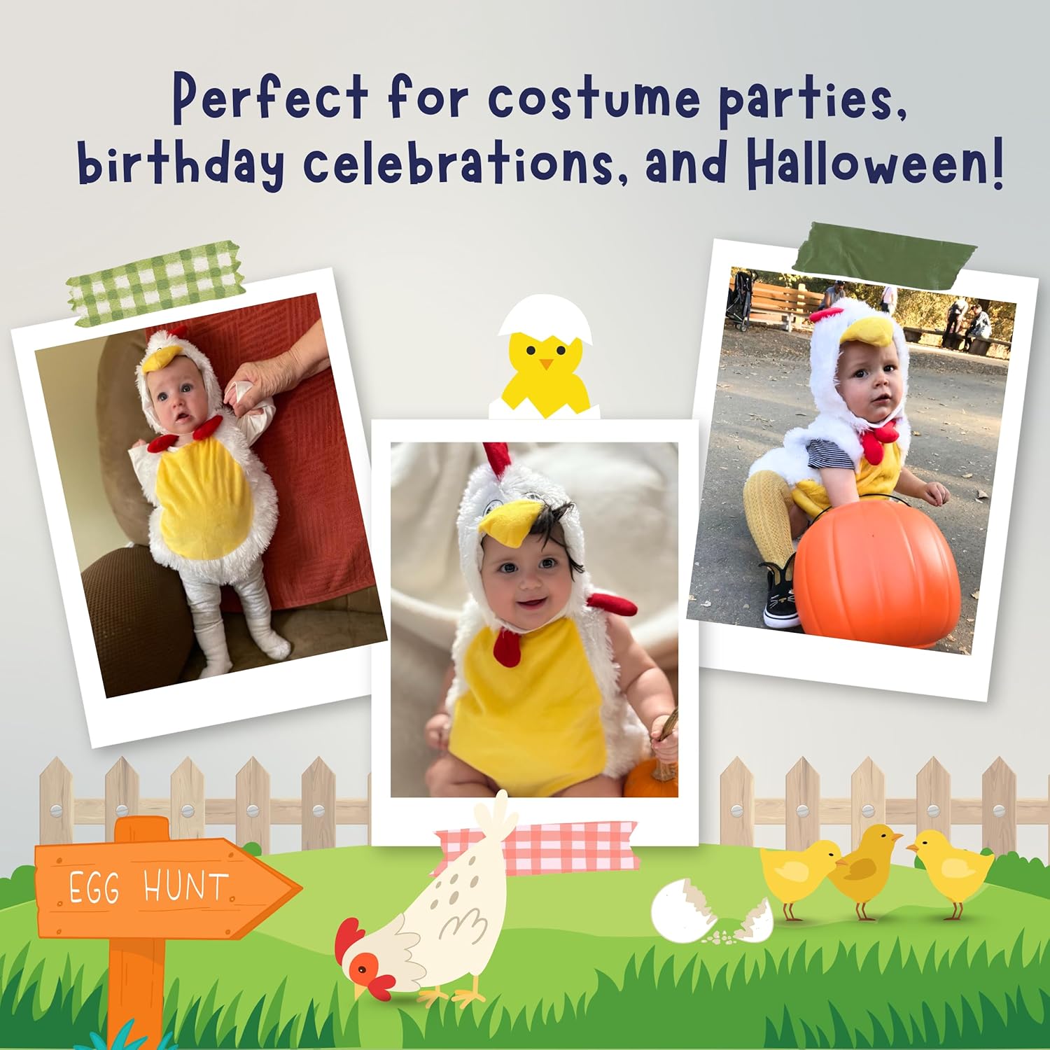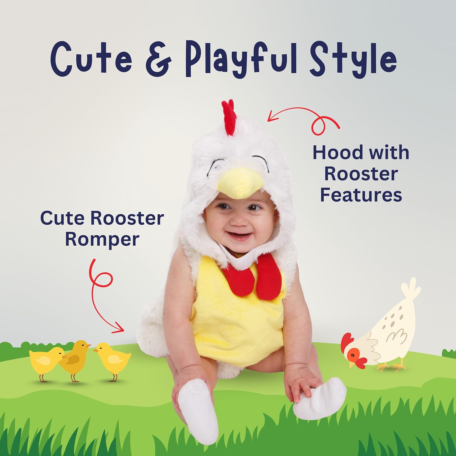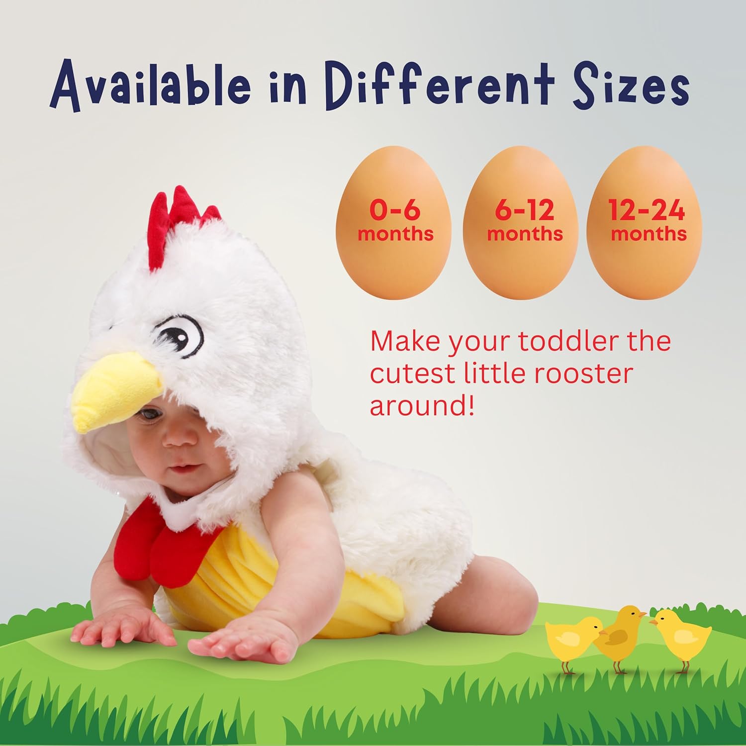 • COCK-A-DOODLE-DO: This adorable rooster/chicken toddler costume for baby girl and boy features a plush bubble bodysuit with a hood.