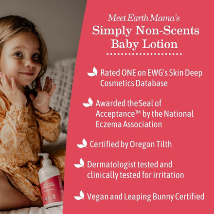 • NON-IRRITATING & CLINICALLY TESTED: Earth Mama’s Simply Non-Scents Baby Lotion is NSF/ANSI 305 Certified by Oregon Tilth, Leaping Bunny Certified and Plastic Neutral.