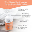 • MOISTURIZING AND SOOTHING SWEET ORANGE CALENDULA LOTION: Earth Mama’s Sweet Orange Baby Lotion is a smooth, moisturizing vanilla-orange blend, rich with organic oils, calendula and rooibos to comfort and soothe delicate skin.
