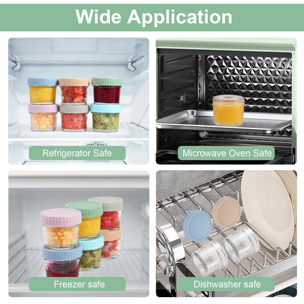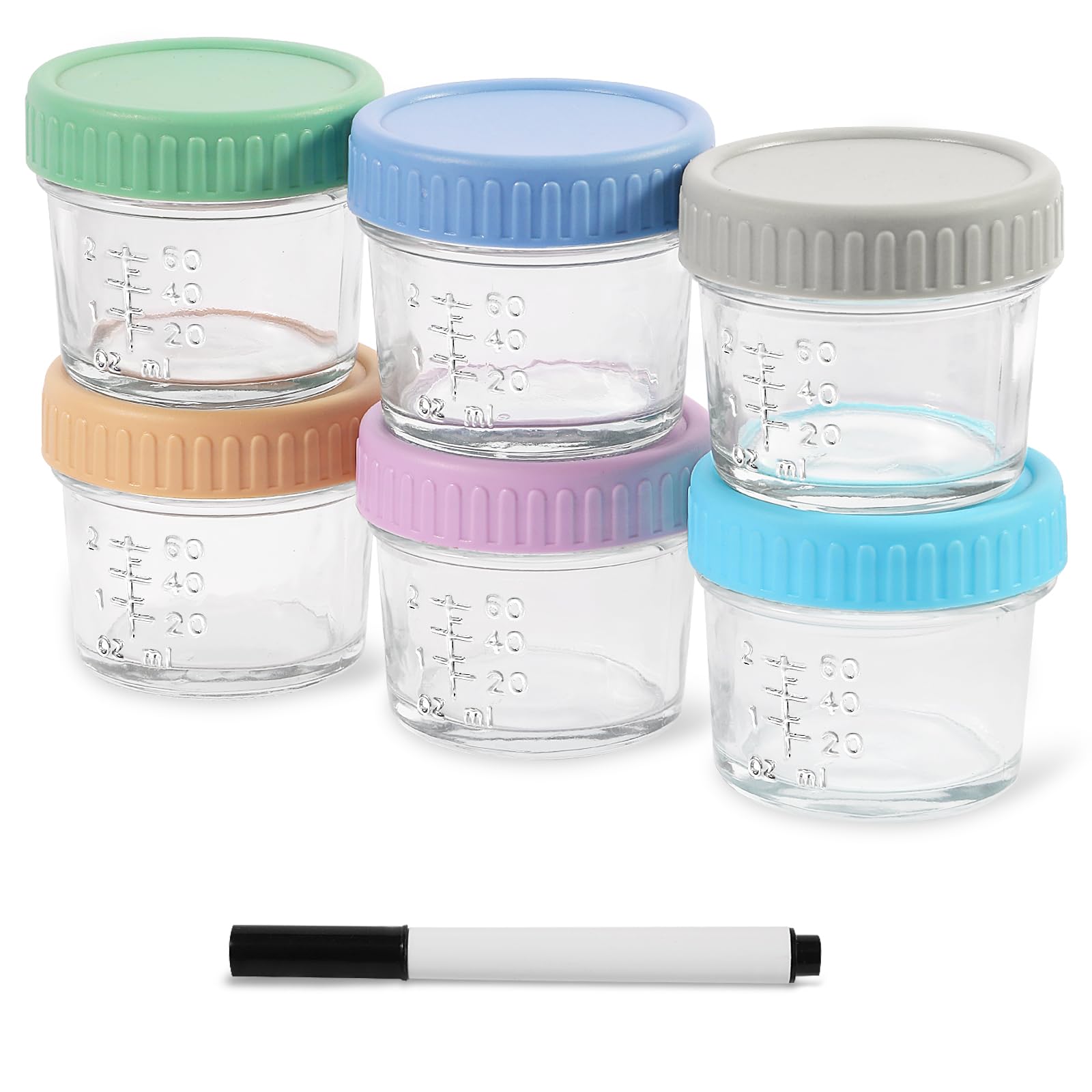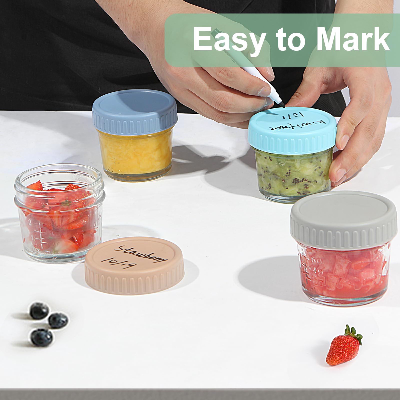 • Baby Food Storage containers Set: Each set baby food containers 6 different color food jars, 4 OZ each, easy to differentiate the use, perfect for busy parents to prepare for baby's daily food. Package comes with a marker to write name, date or other information on the lid to remind you what's inside or when it was made, re-writable and reusable. These jars are versatile and perfect for storing homemade baby food, solid baby food, fruit and vegetable purees and snacks, etc., a baby feeding essentials!