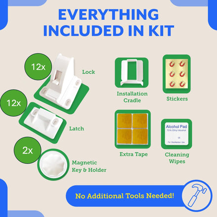 • Complete Child Proofing Kit: Take baby safety to the next level with our comprehensive kit, which includes 12 magnetic cabinet locks, 2 keys, 12 latches, an installation cradle, and extra TESA adhesive tapes