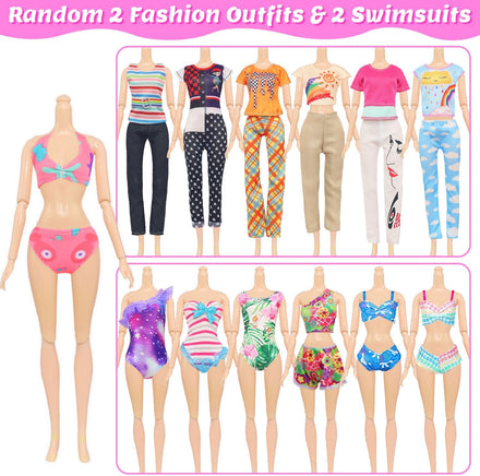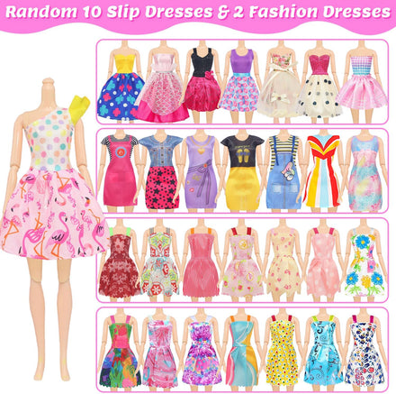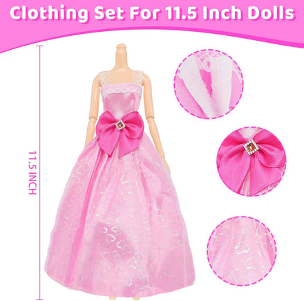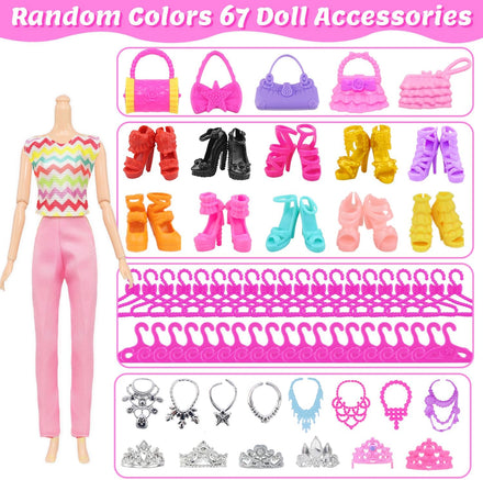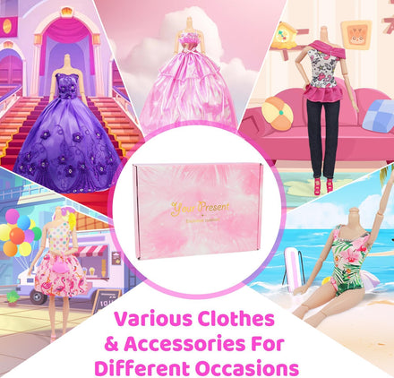 • 101-Piece Surprises in One Gift Box: Includes 5 glamorous gowns, 10 slip dresses, 2 fashion dresses, 2 tops & pants sets, 2 swimsuits, 10 pairs of shoes, 40 hangers, 6 necklaces, 6 crowns, and 5 handbags. Perfect for endless 11.5 inch doll dress up play with random 101pcs Surprises in One Gift Box!