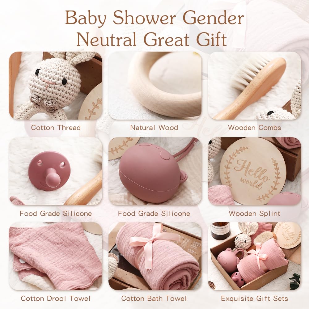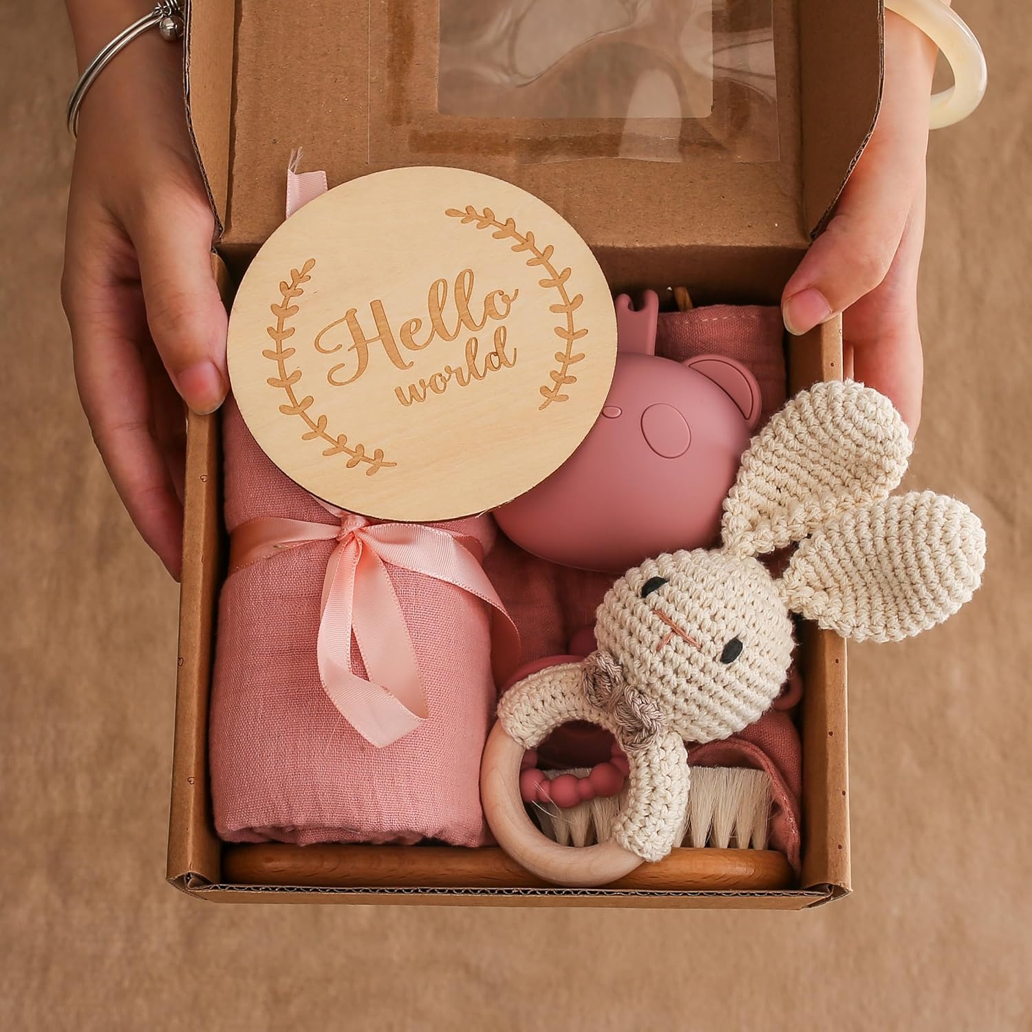 - BABY GIFTS BASKET ESSENTIALS:This new baby gift set is the best way to give your little one a warm and cozy welcome to the world. This baby girl newborn essentials gift includes Muslin Swaddle Blanket, (Bath Towel, Hair Brushes, keaping cleaning(Silicone Baby Teething), traveling(Gift Box), taking pictures (‘Hello World’ Milestone Card), and playing with (Wooden Knitted Rattle) & (Pacifier Leashes & Cases). Complete set ready for gift giving