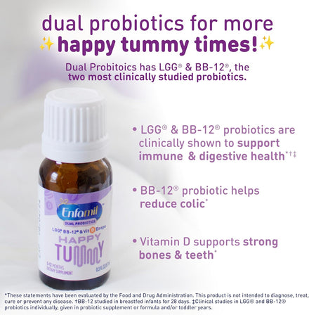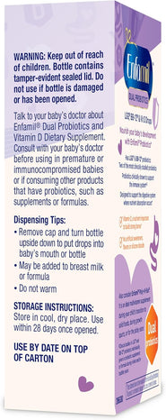 Enfamil Dual Probiotic infant vitamin drops have gentle ingredients to support babies 0-12 months who are exclusively breastfed, supplemented, or transitioning to solid foods. Our probiotic supplement is designed to support the digestive system where nutrient absorption occurs*. This supplement has LGG & BB-12, the two most clinically studies probiotics and are clinically shown to support the immune system*. The BB-12 probiotic also helps reduce your little one's colic*. Enfamil Dual Probiotic also has 100% of the daily value of Vitamin D (400 IU) as recommended by the American Academy of Pediatrics (AAP). It is naturally flavored and does not have ingredients derived from the most common food allergies. Enfamil vitamins are the #1 infant vitamin brand and the #1 recommended infant vitamin brand by pediatricians. The standard serving for Enfamil Dual Probiotics is 6 drops per day. *This statement has not been evaluated by the Food and Drug Administration. This product is not intended to diagnose, treat, cure, or prevent disease.