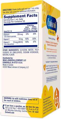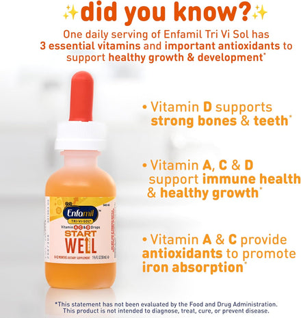 Product Description Enfamil Tri-Vi-Sol drops support babies 0-12 months who are breast fed or combo fed to complement the nutrient profile breast milk has. Tri-Vi-Sol multivitamin vitamin supplement has vitamin D to help your baby’s body absorb calcium for strong bone and teeth development, vitamin A to help support vision, healthy skin, bone and tooth growth, and immune system health, & vitamin C which is an antioxidant that supports protein metabolism, supports immune health, and promotes iron absorption. Tri-Vi-Sol is fruit flavored using natural ingredients and does not have ingredients derived from the most common food allergies. One serving has 100% of the daily value of vitamin D for breastfed infants from 0-12 months as recommended by the American Academy of Pediatrics (AAP), 100% of the daily value of vitamin C. Enfamil vitamins are the #1 infant vitamin brand and the #1 recommended infant vitamin brand by pediatricians. The standard serving for Enfamil Tri-Vi-Sol is 1 milliliter (mL) per day. *This statement has not been evaluated by the Food and Drug Administration. This product is not intended to diagnose, treat, cure, or prevent disease. Brand Story By Enfamil