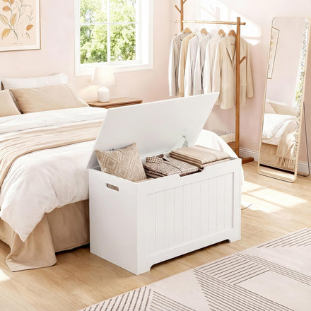 Epetlover Storage Chest with Flip-top Lid, Large Wood Trunk Bench with Safety Hinge, Bedroom Living Room Clothes Blanket Organizer Bin with 100L Storage Area, White