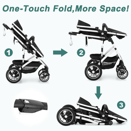 • FOLDABLE DESIGN: The pram stroller offers convenient one-hand folding by simply pressing the button on the handlebar, allowing for a compact fold that can be easily stored in the trunk or a corner space, ensuring practicality and ease of use