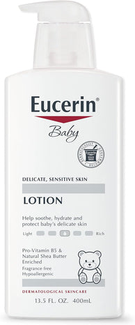 Eucerin Baby Lotion moisturizes and nourishes baby's delicate skin, helping to leave it soft, smooth and protected. This hypoallergenic baby moisturizer formula is gentle enough to use every day and is enriched with soothing ingredients like Pro-Vitamin B5 and natural Shea Butter. Eucerin unscented baby lotion sensitive skin formula is free of fragrances, parabens, dyes and drying alcohols. To use, massage Eucerin Baby moisturizing lotion daily on your baby's skin. For best results, use after your baby's bath. Eucerin Baby skin care products feature gentle formulas for baby skin care needs. Pair this baby lotion for dry skin with Eucerin Baby Wash and Shampoo as part of your baby essentials. Eucerin is a dermatologist and pediatrician recommended skin care brand that is based on an uncompromising approach to science.