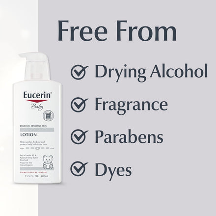 • Free Of: Eucerin moisturizing baby lotion is hypoallergenic, free of fragrances, parabens, dyes and drying alcohols