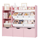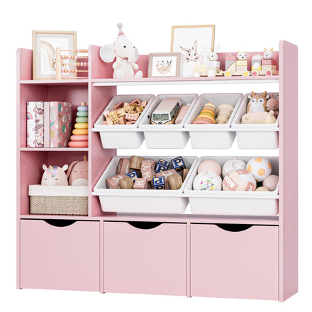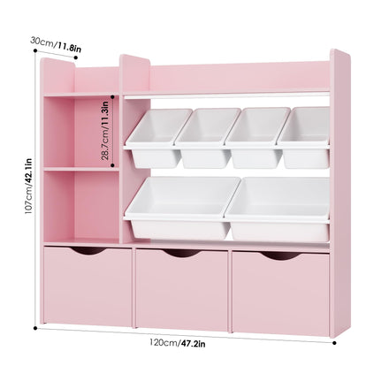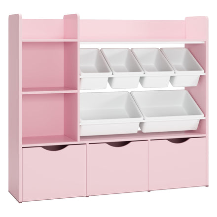 FACBOTALL Toy Storage Organizer with 3 Movable Drawers, Bookshelf and Bookcase with 6 Plastic Bins & 2 Storage Cubbies, Toy Chest with Hidden Wheels, Toy Storage Box for Playroom, School, Pink