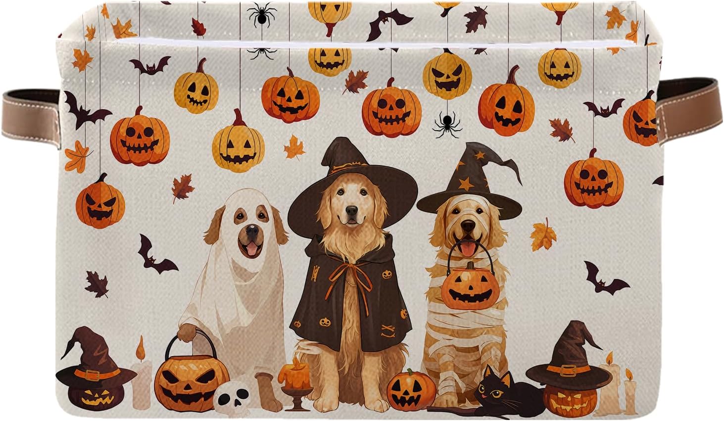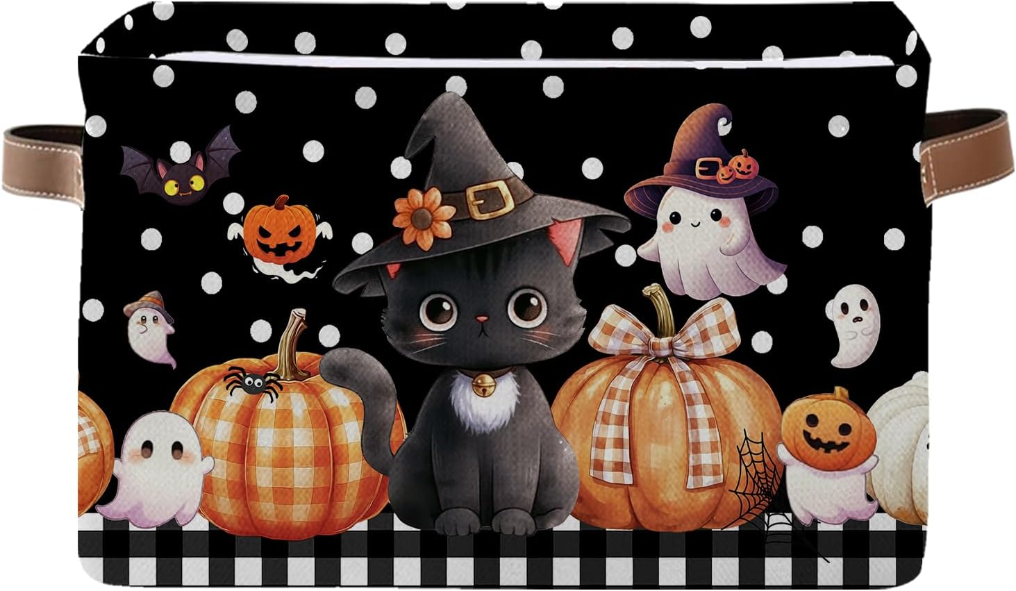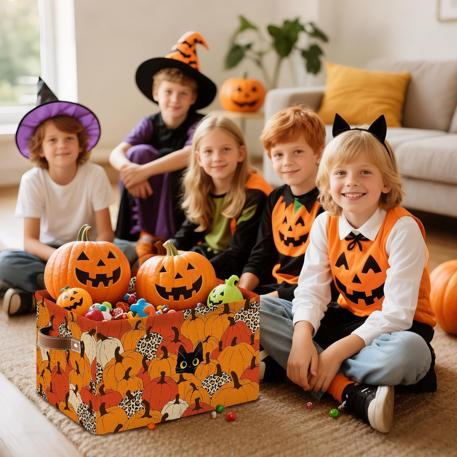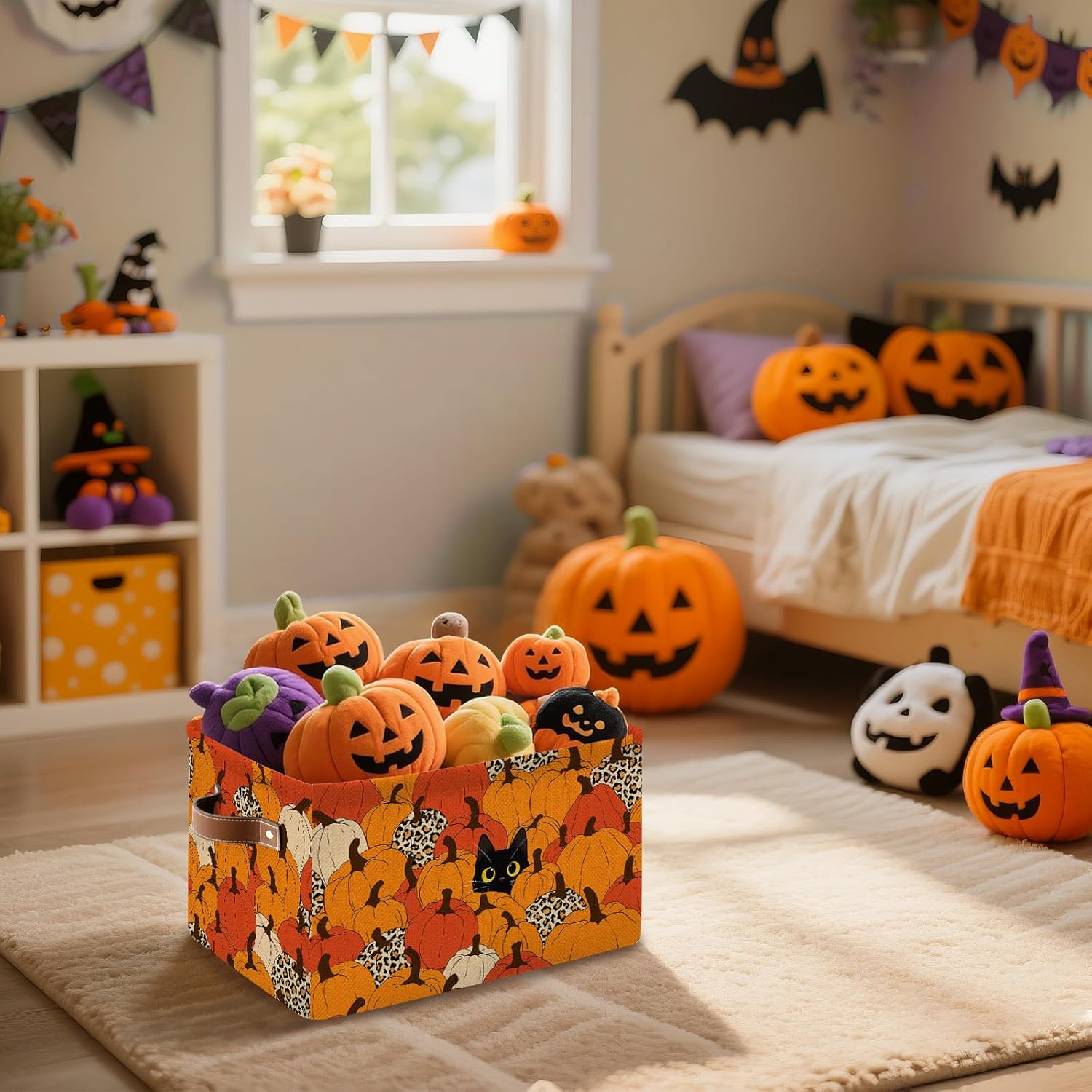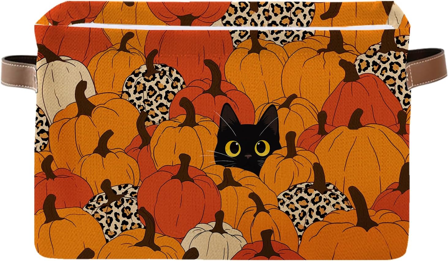 - 【HARVEST CAT PUMPKIN BASKET】Featuring an adorable scene with a playful black cat hiding among a bounty of pumpkins, our Harvest Cat Pumpkin Basket is more than just a storage solution—it’ s a charming autumn centerpiece for your home. Great for organizing small items in the living room, kitchen, or hallway, it can hold toys, blankets, or kitchen essentials and will surely become a favorite spot
