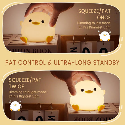 • ๐ƒ๐ข๐ฆ๐ฆ๐š๐›๐ฅ๐ž ๐ƒ๐ฎ๐œ๐ค ๐‚๐ฎ๐ญ๐ž ๐‹๐š๐ฆ๐ฉ๐ฌ: You can touch the lovely ducky night lights with 20 minutes timer choice, no need to manually shut it off. 2 levels different brightness settings: You can tap the dodo duck body to adjust the brightness of this cute lights in the weak and normal gear. Warm and soft lighting, let you sleep easily in a warm and cozy atmosphere. You can of course also use it during the day as a cute night light lamp or a decorative light for their room