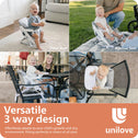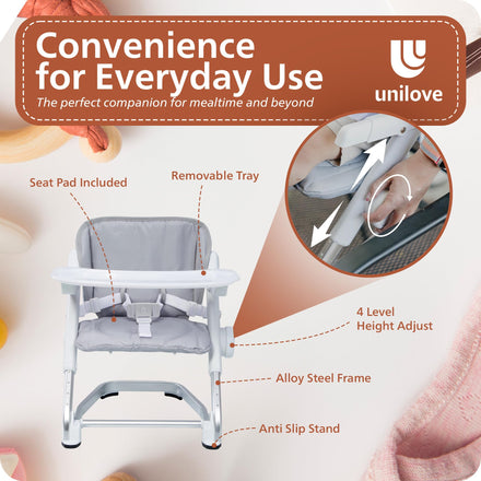 • 3-in-1 Versatility Grows with Your Child: Unilove's Feed Me is the only baby high chair you'll need. Easily transform it from a table high chair to a portable booster seat for table use, or a toddler baby chair. Four adjustable height levels ensure a perfect fit as your little one grows.