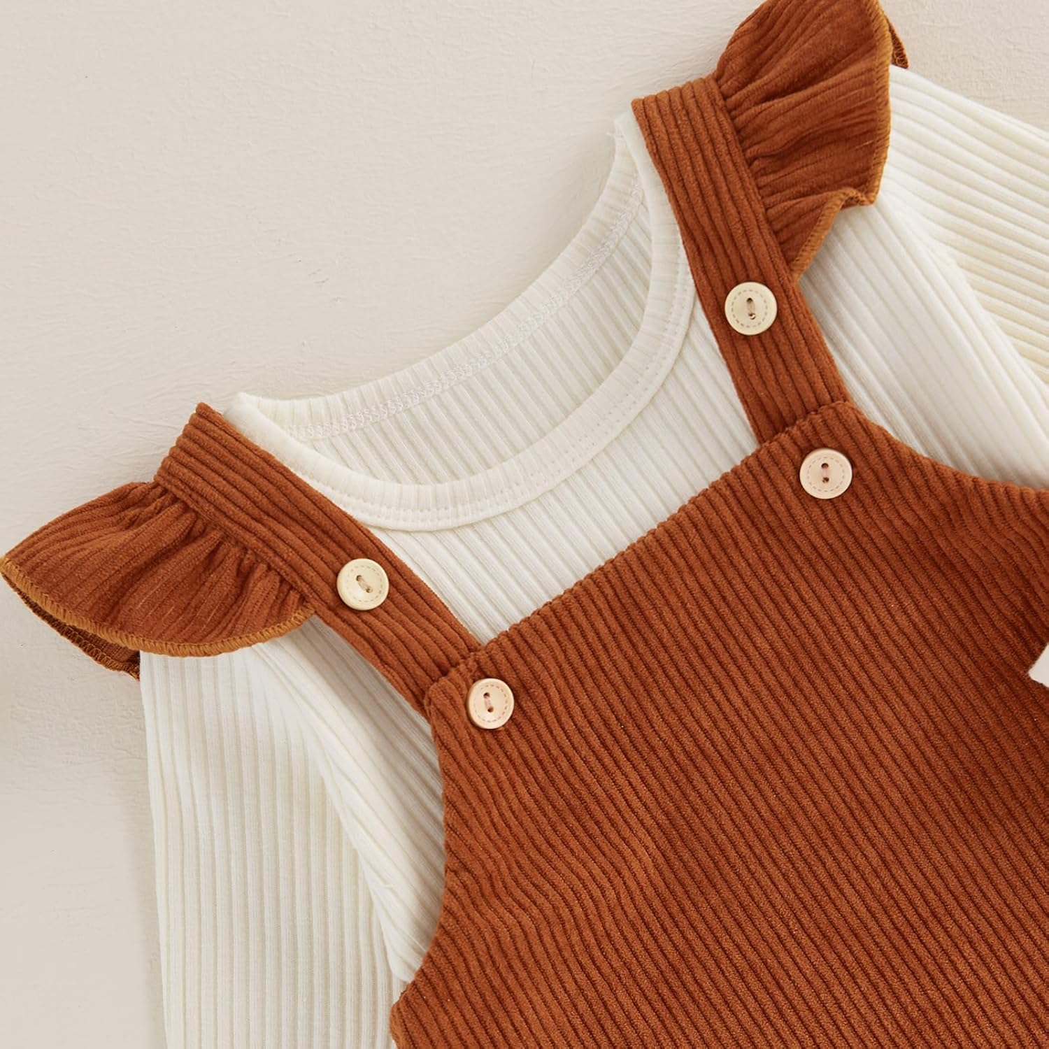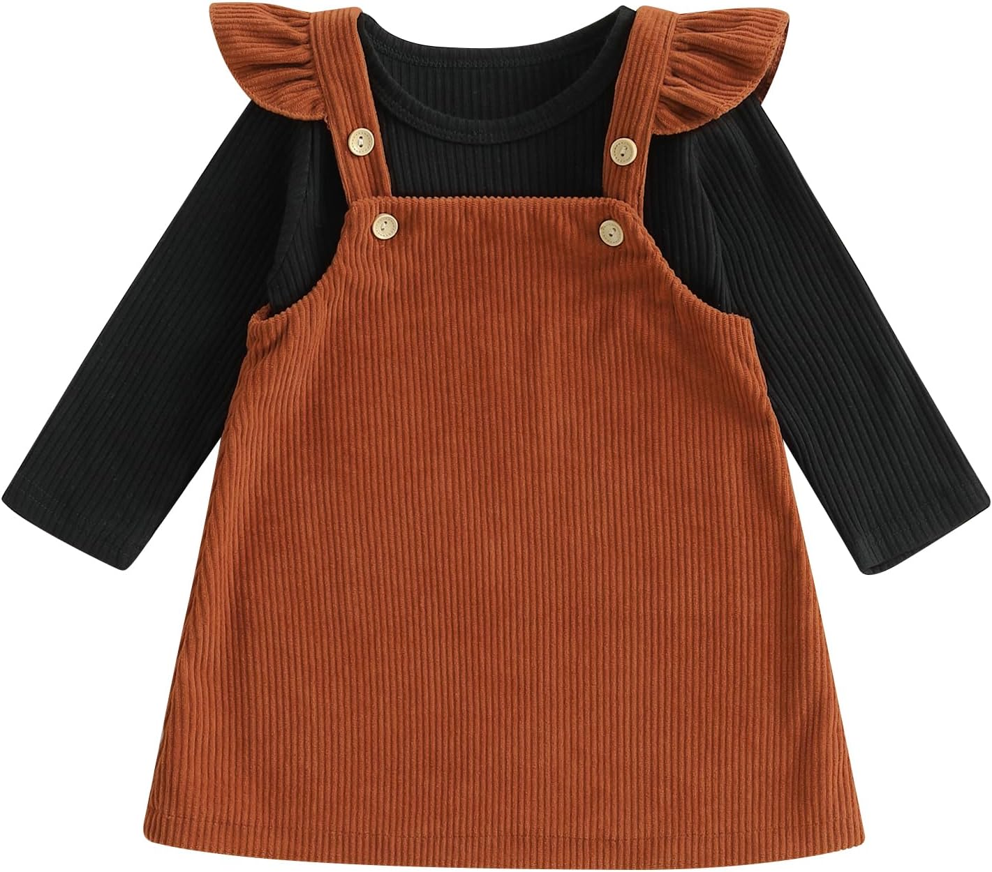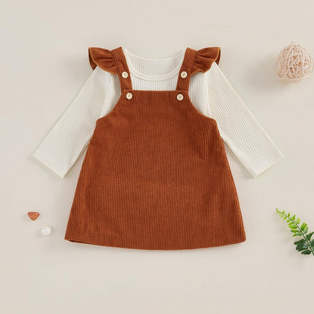 - Design: Infant girls fall winter outfits, long sleeve ribbed knitted round neckline romper top, paired with corduroy shoulder strap skirt. Make your baby girl fashionable and warm