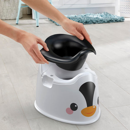 - Potty chair with friendly penguin face encourages toddlers to sit and potty-train