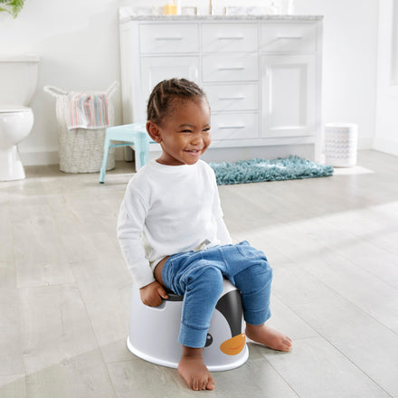 Details: Everybody's gotta learn, and the Fisher-Price™ Penguin Potty helps the training process along with a chill potty pal. Its friendly face and easy-grasp handles help toddlers feel more comfortable and secure as they do their business, while the built-in splashguard and removable bowl helps keep cleanup quick and easy. This unflappable potty pal helps everyone stay cool during the potty-training process! Where development comes into play Gross Motor: As kids independently lower themselves onto the potty (and get back up again!), they'll develop balance & coordination. Self-Identity: Every successful visit to their potty pal helps build up your toddler's self-confidence! Security & Happiness: The low seat and easy-grasp handles help toddlers feel secure and grounded as they sit on the potty and are introduced to the potty routine.
